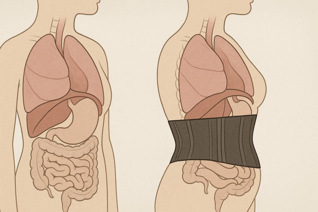 Korset pelangsing menekan organ internal—lambung, usus, liver—ke posisi yang tidak alami. Ini bisa mengganggu pencernaan dan metabolisme. Beberapa klienku mengeluh mual dan refluks setelah latihan pakai korset.